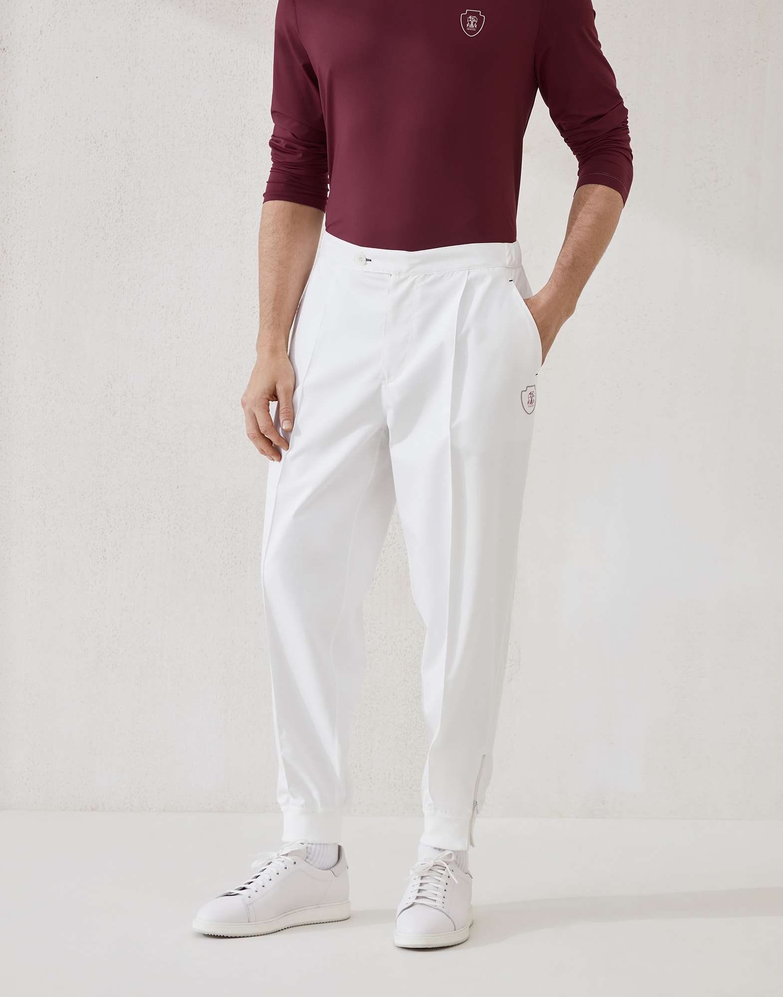 スポーティな趣きとともに洗練されたテニスウェアがインスピレーションとなった、メンズコレクションに豊かさを添えるアイテムセレクション。ナイロンのさわやかな軽やかさが活躍の場を選ばないこのトラウザーズの雰囲気のポイントとなり、バランスの取れたスタイルのコントラストを作り出すサルトリアルエレメントで華やかに仕上げられています。フロントのウエストタブとクリースを伸縮するジッパー付きのアンクルカフスに組み合わせて、快適なフィット感を完成させたモデルです。