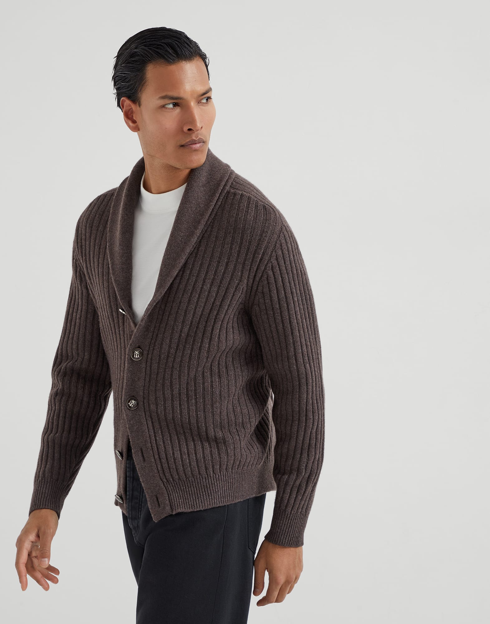 Brunello Cucinelliニットウェアの高級感がアレンジされた、クラシックなカシミヤ製ショールネックカーディガン。アイコニックなヤーンでやわらかさと保温力を与え、フラットリブの風合いでカジュアル感を引き立てました。メタリックボタン開閉部でレギュラーフィットのボリュームを仕上げています。