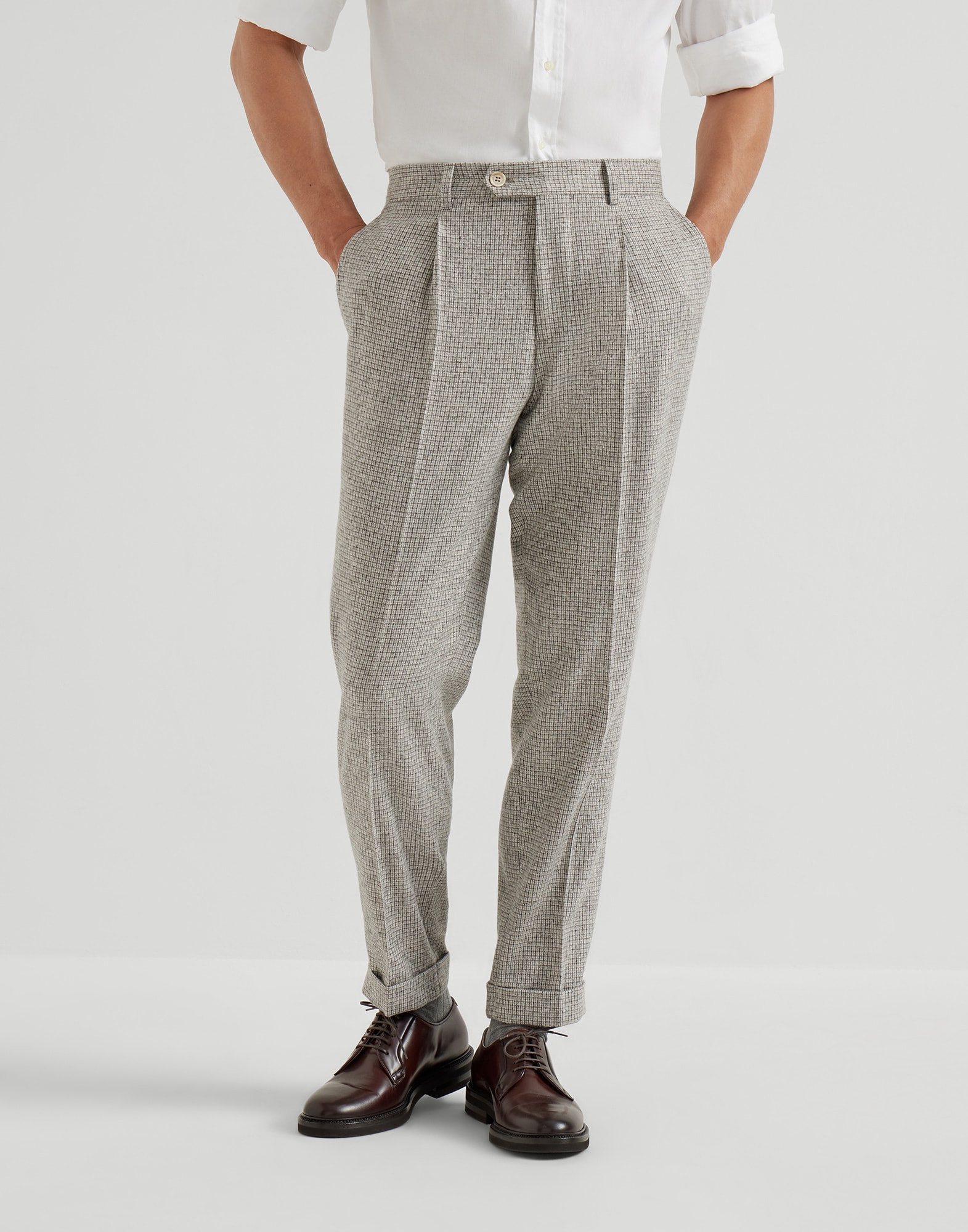 厳選繊維を組み合わせることで、本質的なテイストとクラシックな趣きをさらにランクアップさせた、シルク&ウール&カシミヤフランネルのレジャーフィットトラウザーズ。ドネガルヤーン特有のメランジュエフェクトでチェック柄のライトウェイトフランネルにアクセントを与え、サルトリアルシルエットに華やかさを添えました。腰部分のボリュームはゆったり、クロッチはやや低め、レッグラインは脚に沿ったレジャーフィットに仕立てています。