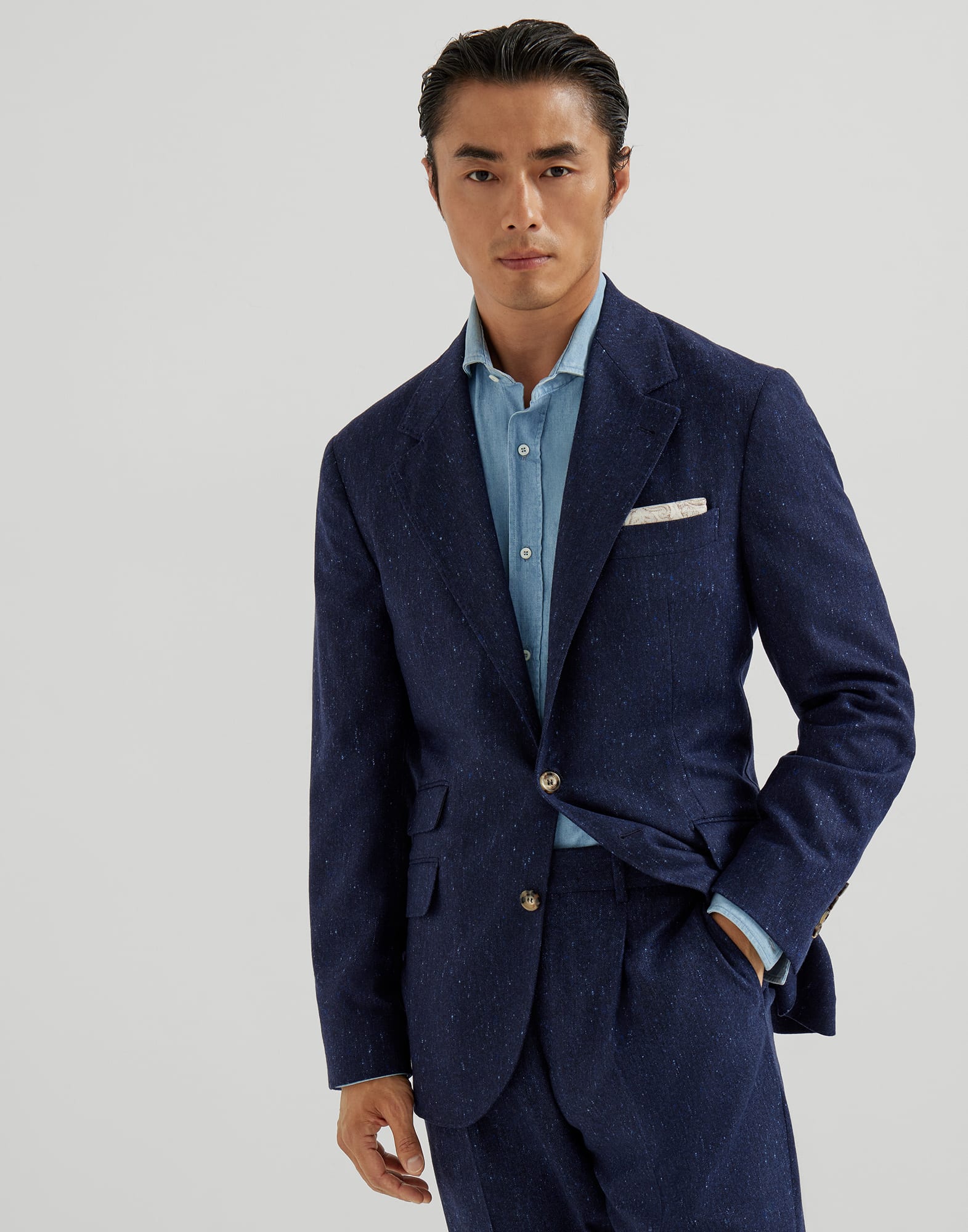 高級ヤーンと布づくりの伝統の見事な組み合わせが、斜めのフラップポケット付き アンコンストラクテッド カヴァッロ フォーマルジャケットのコンテンポラリーなテイストとアンコンストラクテッドなシルエットを引き立てます。ドネガルヤーンのほのかなメランジュエフェクトで華やかさを添えた包み込むような軽量布地、ウール&カシミヤシャークスキン特有の織り地で趣向を凝らした色合いを引き立てました。Brunello Cucinelli本社のある集落の名にオマージュした「ソロメオショルダー」が独特のプロポーションをなぞり、このブランドの独自性を引き立てています。すっきりとしていながら存在感があるショルダーラインで、肩パッドを使用せずに男性の体格を魅力的に際立たせました。
