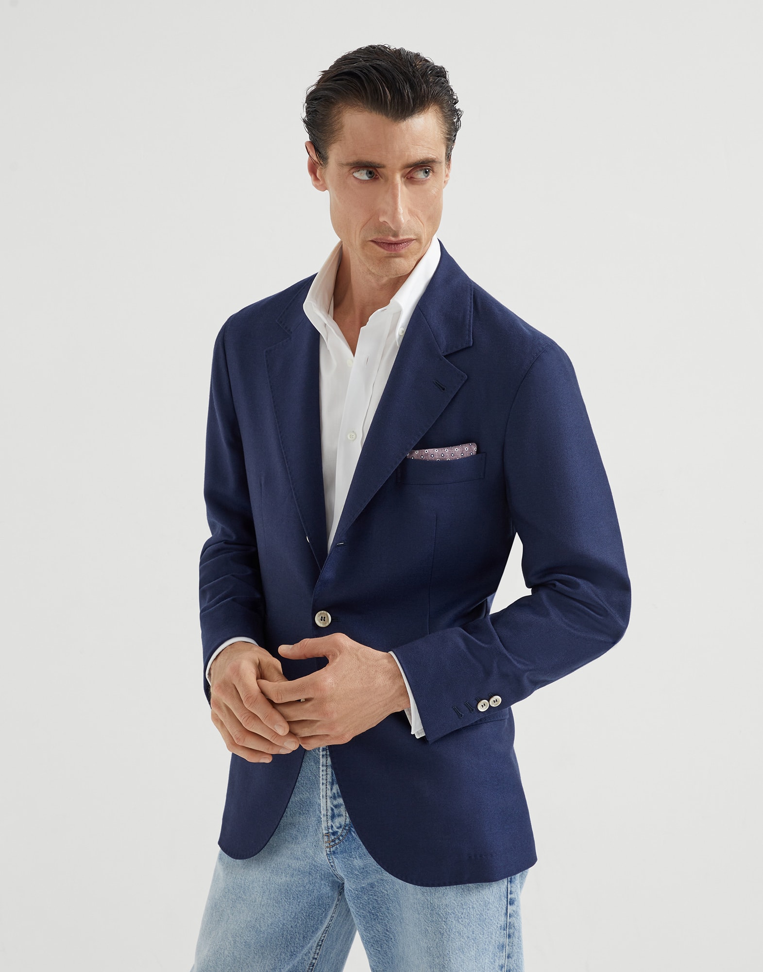 サルトリアル感とコンテンポラリーテイストの繊細なバランスを調和させた、本質的で活躍の場を選ばないシルエットのアンコンストラクテッドフォーマルジャケット。極めて軽やかで快適なカシミヤのライトウェイトツイルに使用された高級繊維に本来備わる特性で、アイテムの魅力が高められています。Brunello Cucinelli本社のある集落の名にオマージュした「ソロメオショルダー」が独特のプロポーションをなぞり、このブランドの独自性を引き立てています。すっきりとしていながら存在感があるショルダーラインで、肩パッドを使用せずに男性の体格を魅力的に際立たせました。