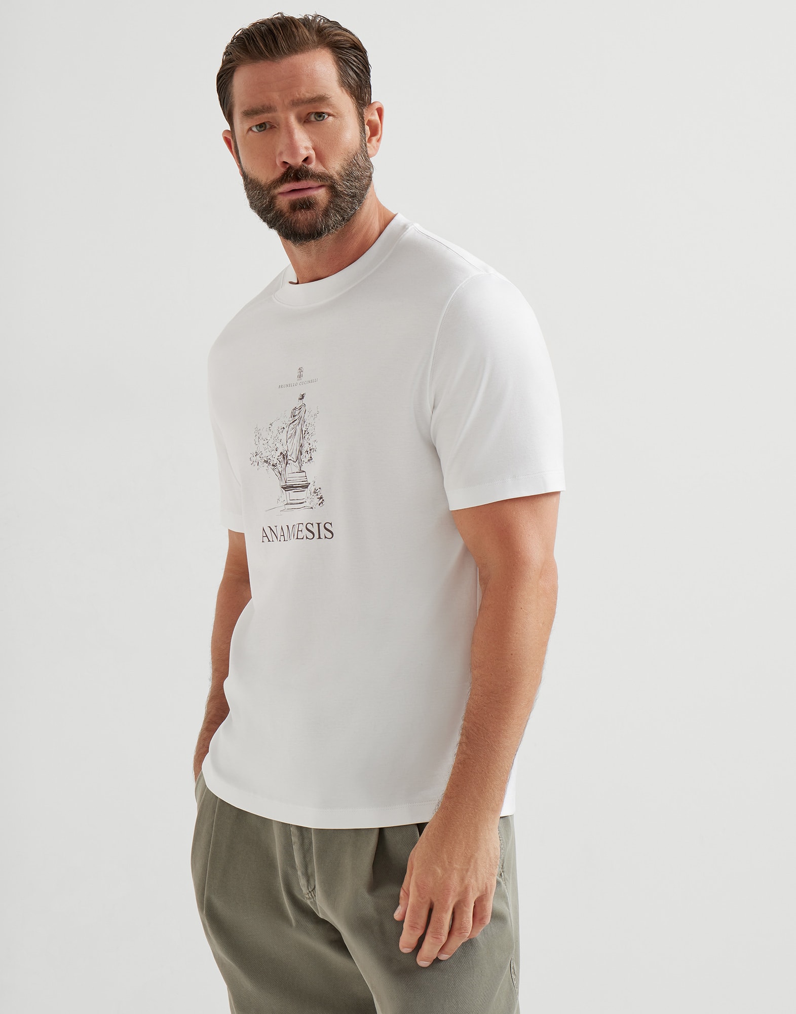クリエイティブなインスピレーションと高級素材が、クルーネック半そでTシャツのすっきりとしたシルエットの中で出会います。ピュアコットンジャージーのなめらかでコンパクトな表面へ、コントラストを生み出すプリント「アナムネジス」を装飾しました。熟考することと知識の価値を喚起する言葉です。ストレートで快適なラインに仕上げました。