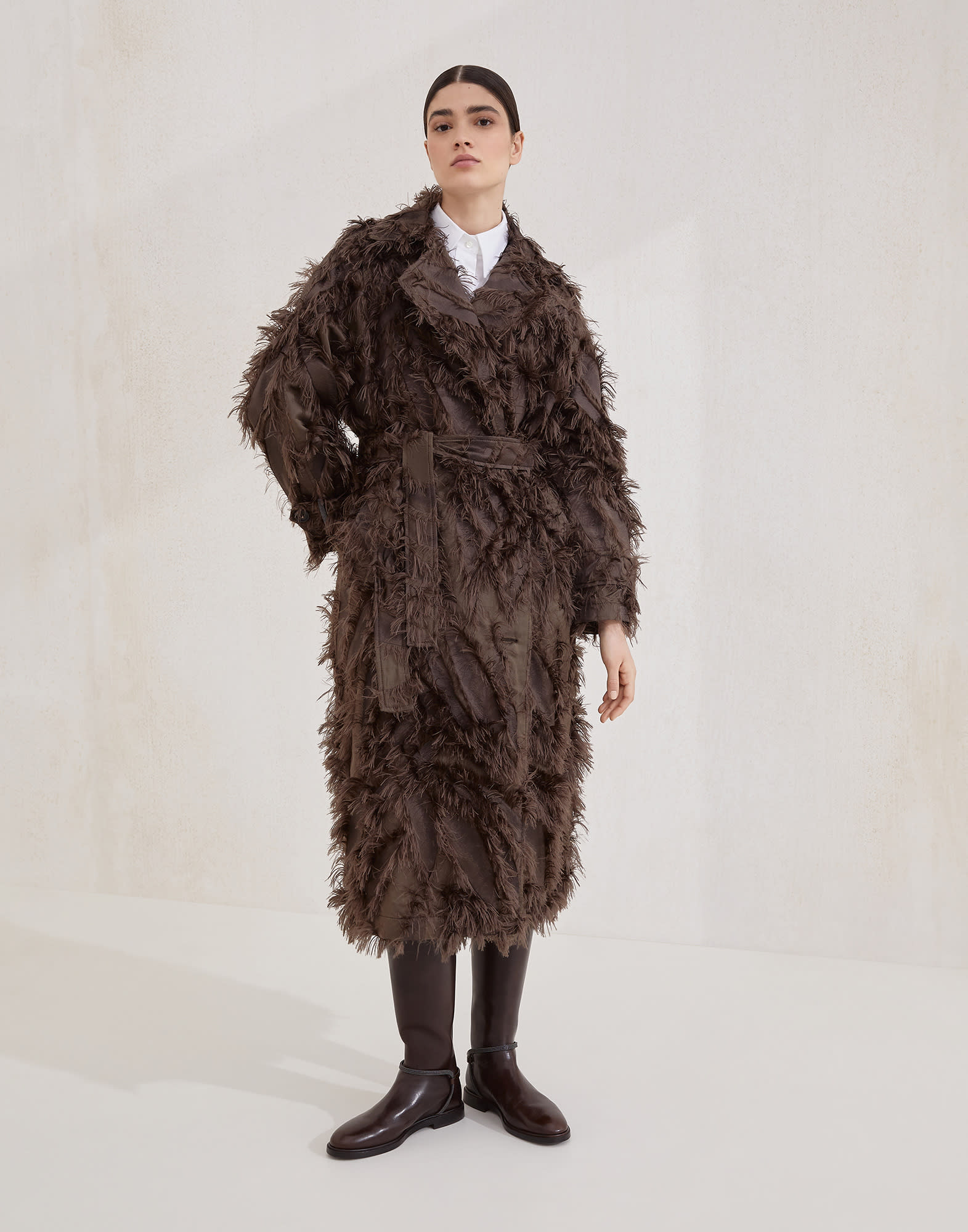 趣向を凝らした細工と自然の美しさをヒントにしたモチーフがひとつになった、コットン&ハイテクシルクのドラセナフィルクーペで仕立てた新作コート。フィルクーペ技法で、フリンジを施し意図的にイレギュラーに仕上げることで、ドラセナの繊細な葉を思わせる布地を作り出しました。結んでスタイリングする実用的なベルトでボリューム感をまとめ、ウエストをバランスよくマークするモデルです。袖口にはブリリアントなモニーレ刺繍をあしらい、純粋なBrunello Cucinelliスタイルの繊細なきらめきを添えています。