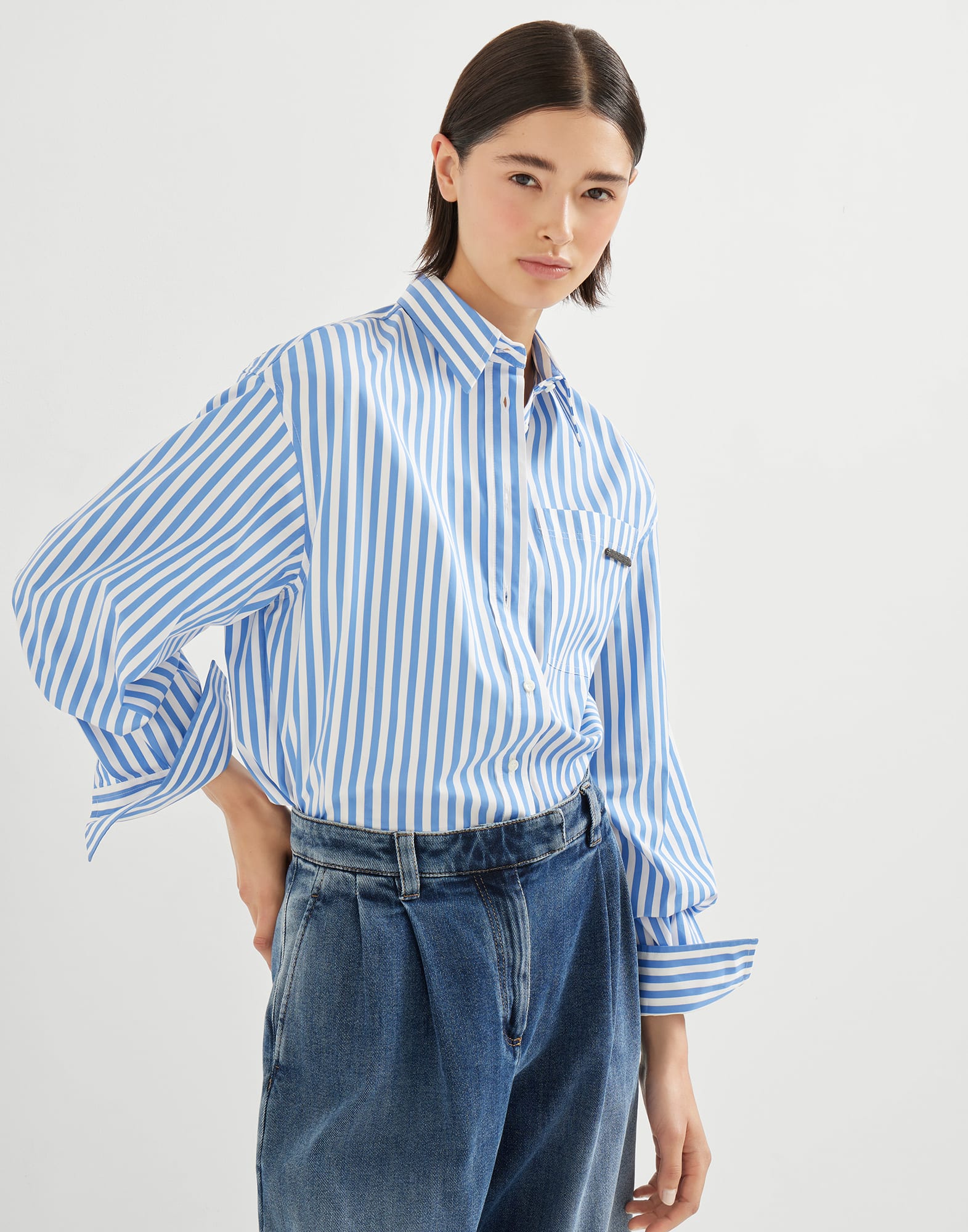 ストライプ柄に見られる定番のメンズテイストを洗練されたディテールで一新した、コットンストライプポプリン製の新作シャツ。やわらかなボリューム感に仕上げた半袖のモデルがバルーンシルエットのようなラインを描き、極めてフェミニンなフィット感に仕立てられています。Brunello Cucinelliコレクションならではの装飾であるブリリアントなモニーレの列を刺繍した小さなラベルで胸ポケットに華やかさを添え、高貴なきらめきのディテールで完成させました。