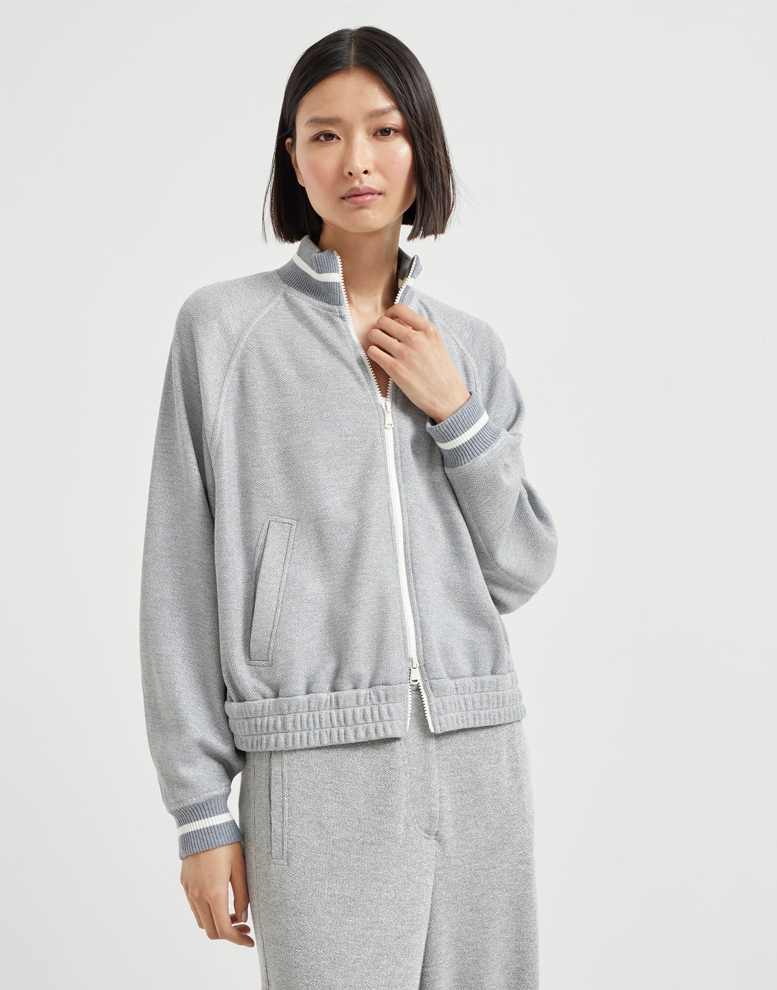 繊細なきらめきでスポーティなスタイリッシュさに豊かさをプラスした、コットン&ヴィスコースのスパークリングピケで仕立てた新作ジップアップジャケット。ボンバージャケットをヒントにしたこのモデルはゆったりとしたシルエットが特徴で、伸縮性を持たせたリブ仕上げの裾でクロップ丈のボリュームをまとめ、ゆったりとしたフィット感を引き立てています。ラメヤーンのきらめきで、コットンピケのリラックスした雰囲気をランクアップさせました。