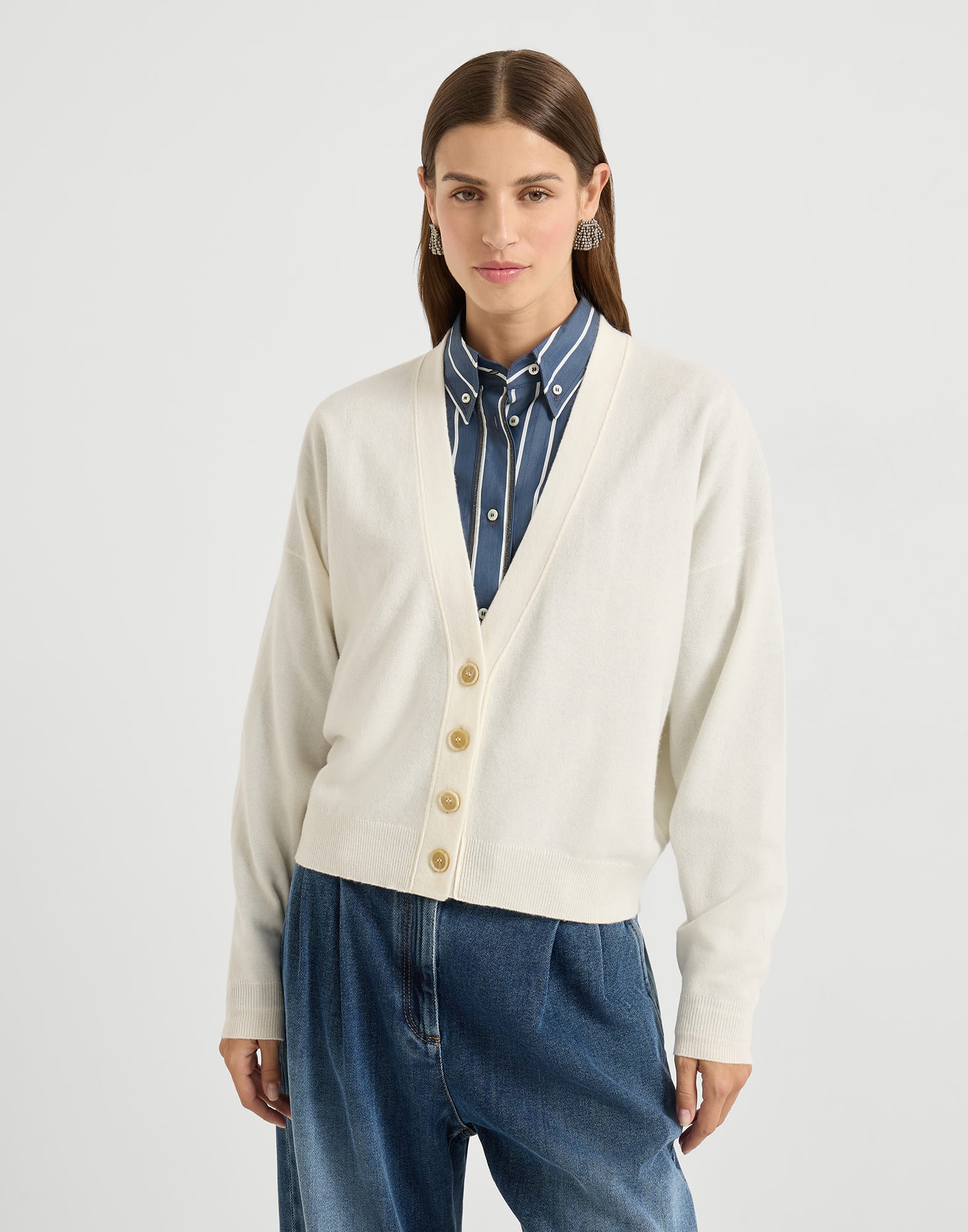 カシミヤ製カーディガンの時代を超えたテイストが、Brunello Cucinelliウィメンズコレクションならではの装飾の高貴で優雅なタッチに出会いました。ブリリアントなモニーレの刺繍で、後ろえりに繊細で思いがけないきらめきのラインを与えています。ホーン製ボタンとリブニットのすそとカフスで、カーディガンに趣向を凝らした快適なスタイルを加えて仕上げました。