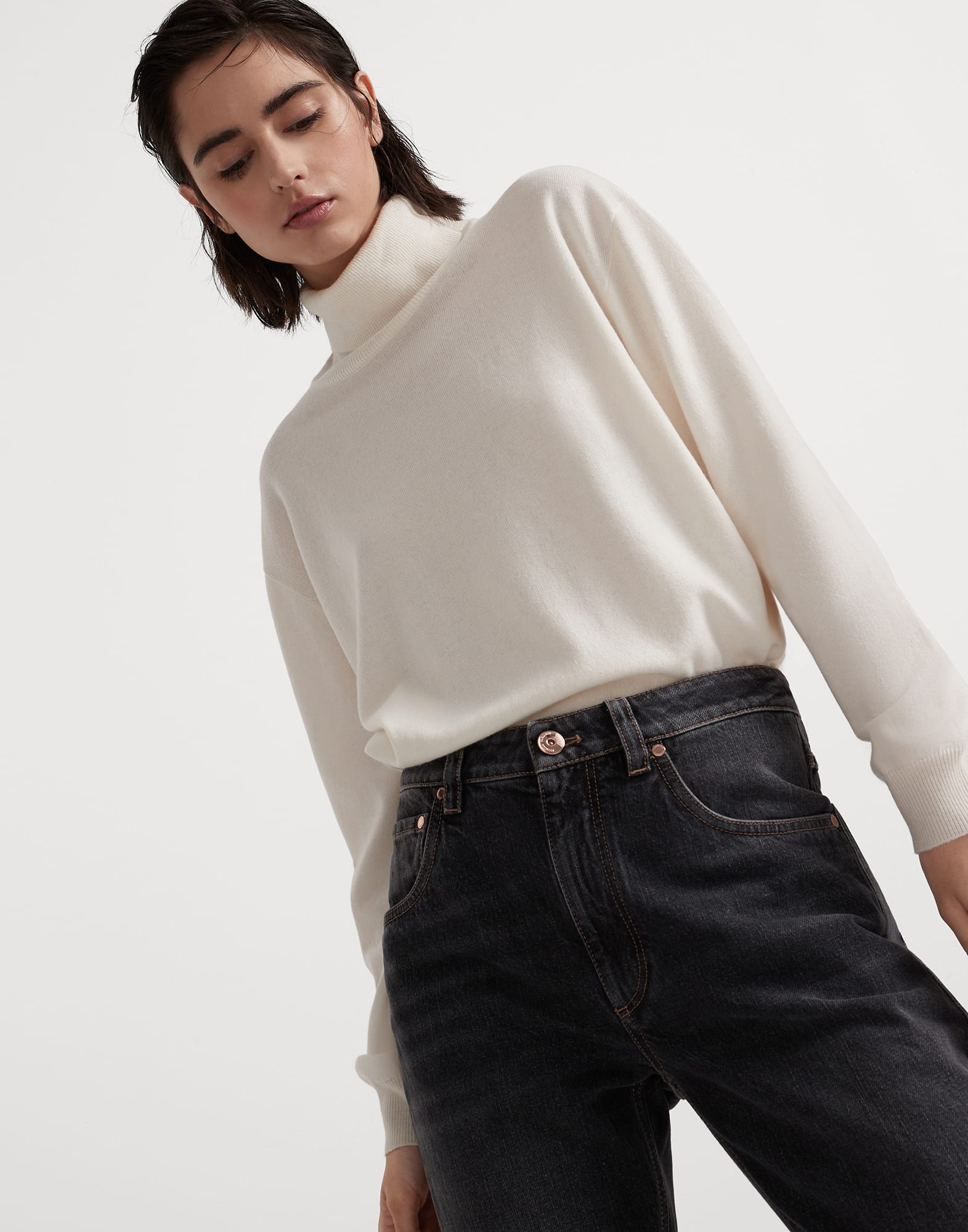 やわらかく温かい、ピュアカシミヤを編み上げたタートルネックセーター。快適なデザインと新鮮でフェミニンなディテールが特徴です。包み込むような美しさをブリリアントなモニーレの列からなる刺繍に組み合わせて、後ろ襟に高貴なポイントをプラスしました。ソフトなラインでゆったりとしたテイストに仕上げたアイテムです。
