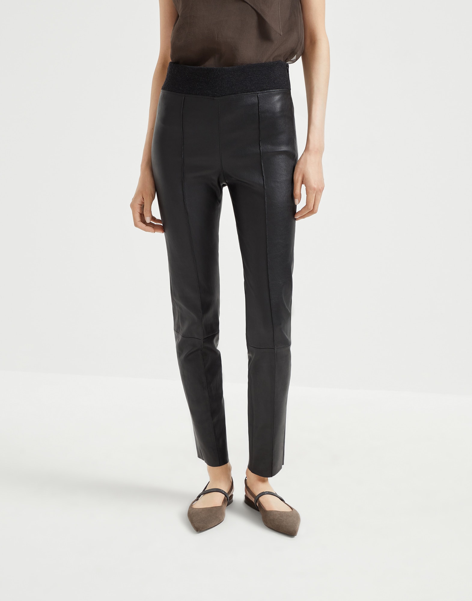 Brunello Cucinelliの高級素材で豊かさをプラスした、レディースワードローブで愛され続けるモデルであるストレッチナッパで仕立てたレギンス。しなやかな皮革の大胆な雰囲気が、体にぴったり沿わせたシルエットと完璧な調和の中で対話し、バージンウールのプルアップバンドで着心地よく仕上げました。