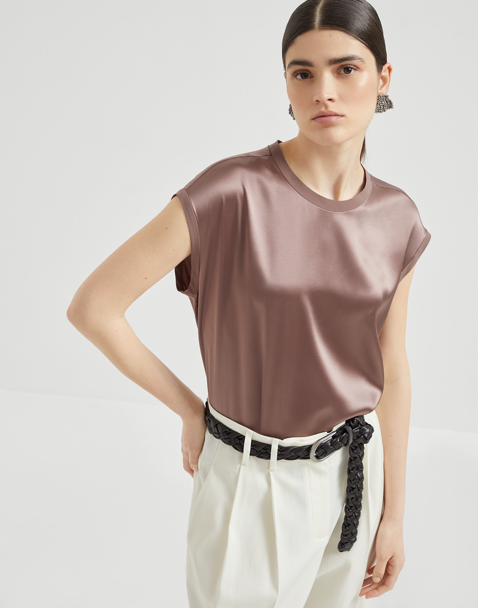 Brunello Cucinelliコレクションならではの装飾をスタイルのポイントとした、レディースワードローブに欠かせないアイテムであるストレッチシルクサテン製Tシャツ。布地のまばゆい風合いを、ブリリアントなモニーレのディテールに組み合わせました。後ろえりの小さなボタンで着脱しやすく仕上げた、ややドロップショルダーの快適なフィット感のアイテムです。