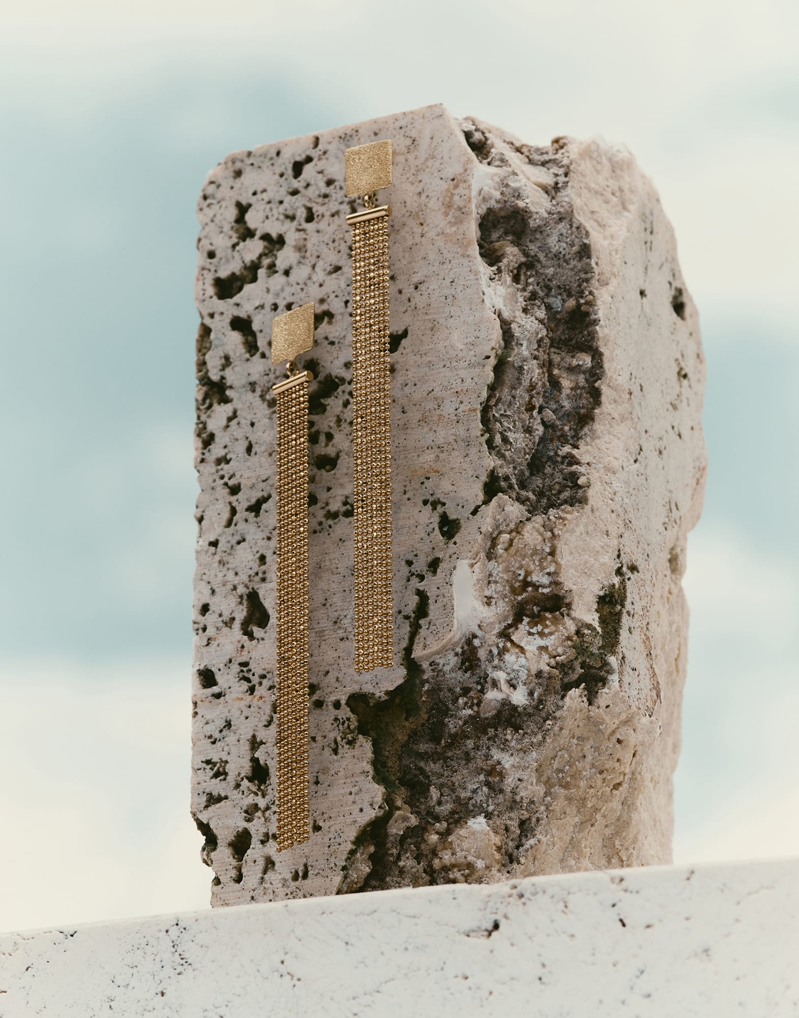 18金イエローゴールドのイヤリングです。モニーレの細い列を束ねたこのジュエリーは、一歩ごとに豊かなきらめきを放ちます。ベース部分は、洗練された「ダイアモンドカッティング」技法で仕上げました。特殊なタガネを使用して金の表面に彫金を施し、きらめきを強調する職人技です。