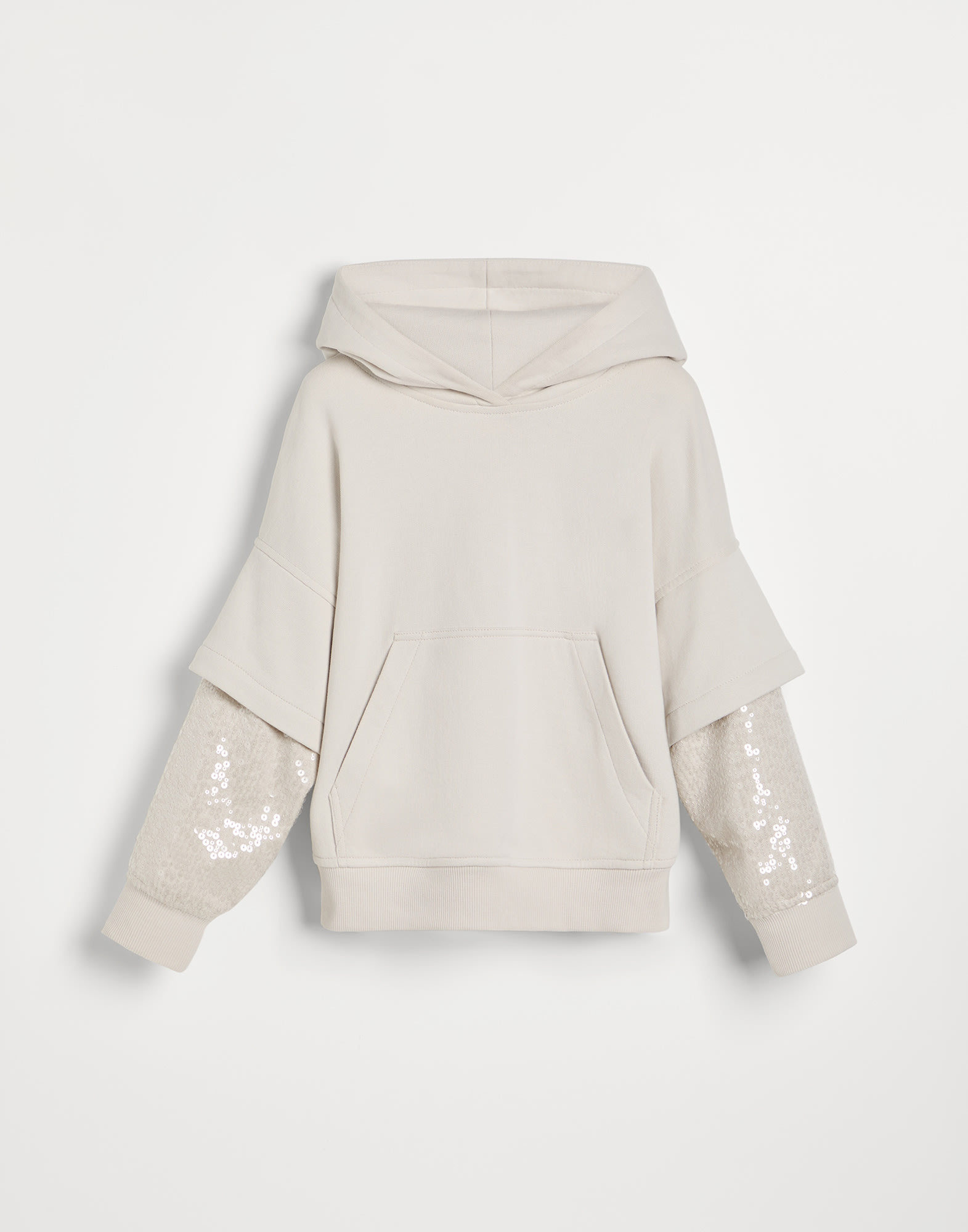 高級繊維の包み込むような柔らかさが特徴のBrunello Cucinelliのトラベルウェア。くつろぎのひとときや楽しい遊び時間のために考案されたスポーティテイストのアイテムを通じ、小さな子どもたちにもその感覚を伝えます。コットンのスムースフェルパを使用したスウェットパーカー。フェイクレイヤリング効果を取り入れ、1枚のウェアの中でレイヤリングスタイルが楽しめるのが特徴です。スパンコールをほっそりと並べた袖のダズリング刺繍で、洗練されたきらめきのアクセントを添えています。