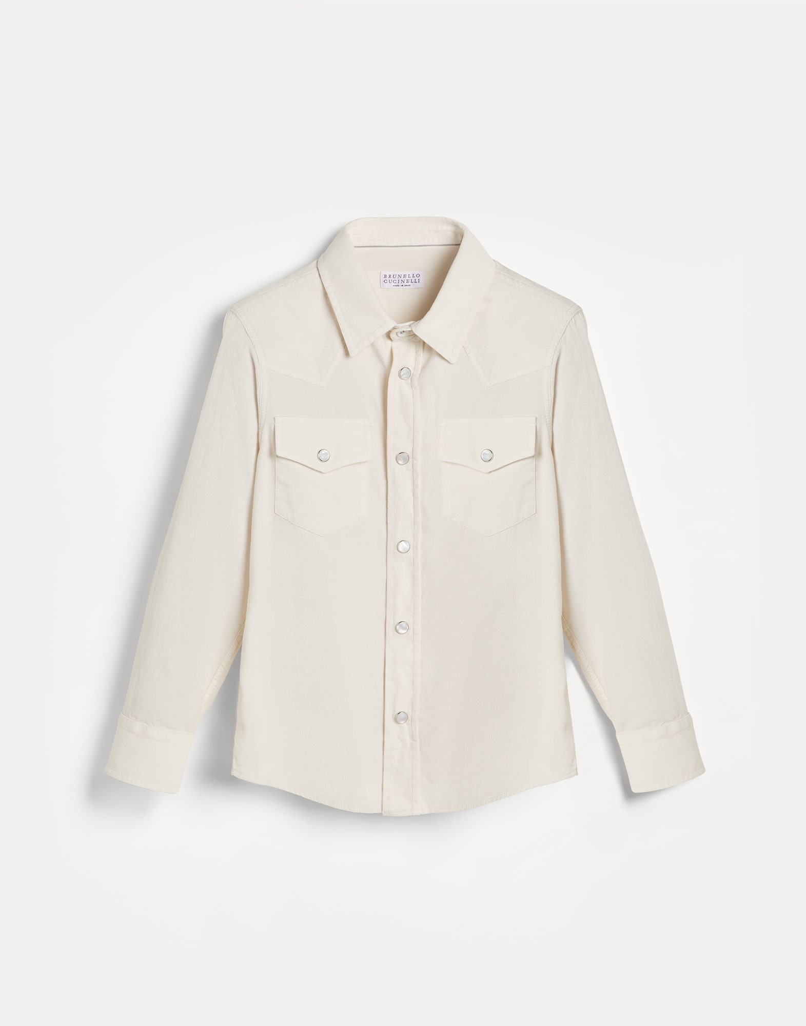 Brunello Cucinelliならではの布地と趣向を凝らしたディテールを組み合わせた、軽やかなボーイズコレクションのシャツです。ガーメントダイを施したやわらかな細畝コーデュロイがフラップポケットディテール、スナップボタンとダブルステッチで強調したヨークと完璧にマッチしています。レギュラーで快適なラインに仕立てています。