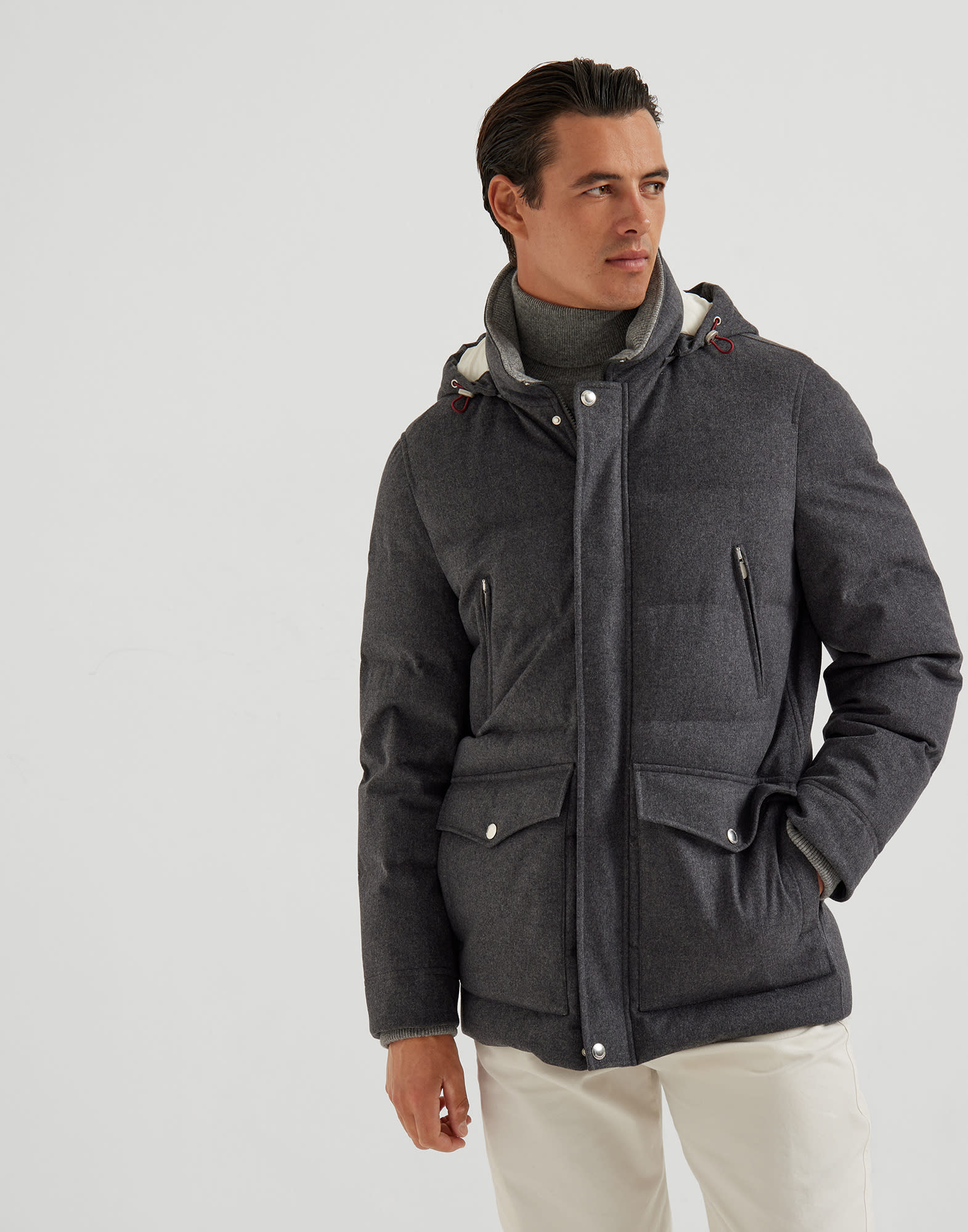 高級ヤーンと高度な加工や細工がカジュアルで機能性を重んじる精神に出会った、繊細なコントラストのバランスが見事なダブルクロージャー式ダウンジャケット。フードは取り外せるデザインです。ピュアウールフランネルのなめらかで流れるような風合いがメンズテーラリングの趣きを思い起こさせます。内側には風雨から体を保護するフィルムを施しました。腰丈のショートフィットを胸のジップ式ポケットと下部のポケットで完成し、薄手のパディングを入れることで快適なレギュラーボリュームを実現しています。