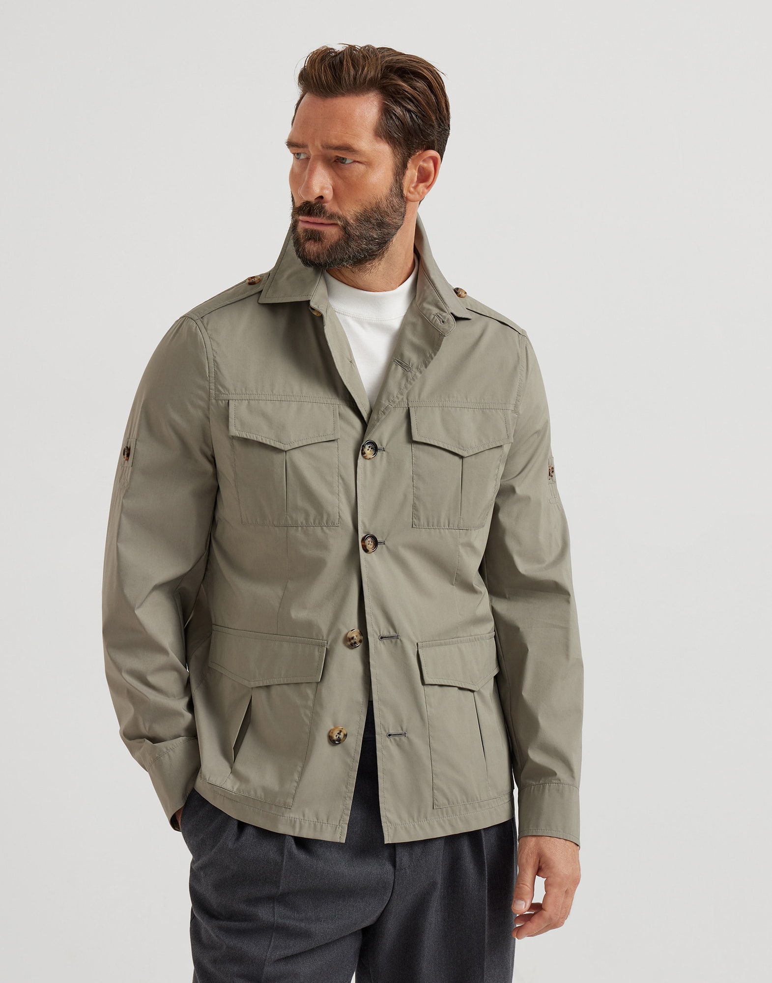 Brunello Cucinelliの高級素材と心遣いで、活躍の場を選ばない機能的なスタイルをランクアップさせた、ライニングなしのハイテクコットン製ポプリン地のフィールドジャケットです。典型的なカジュアルさをかもし出す生地の、軽やかな表面は滑らかな手触りです。クラシックなラインを完成させるのは、シャツカラーと大ぶりなフラップポケット4つで、スタイルと実用性を併せ持つディテールとなっています。