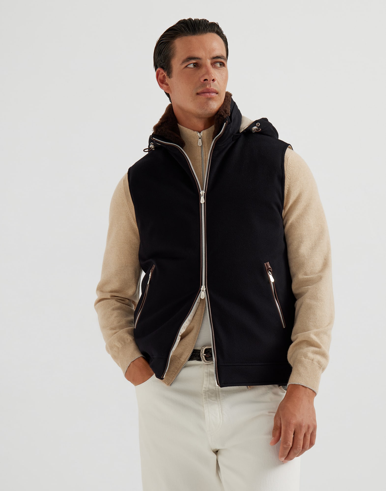 さまざまな雰囲気やスタイルを洗練性豊かに組み合わせたフード付きダウンベスト。Brunello Cucinelliの素材の高級感と高度な加工・細工を革新的で機能的なシルエットに合わせた作品です。ピュアウールフランネルのなめらかで流れるような風合いがメンズテーラリングの趣きを思い起こさせます。内側には風雨から体を保護するフィルムを施しました。取り外し可能なシアーリング製インサートでスクエアフィットを完成し、軽くフィリングを施して快適なレギュラーボリュームを実現しています。