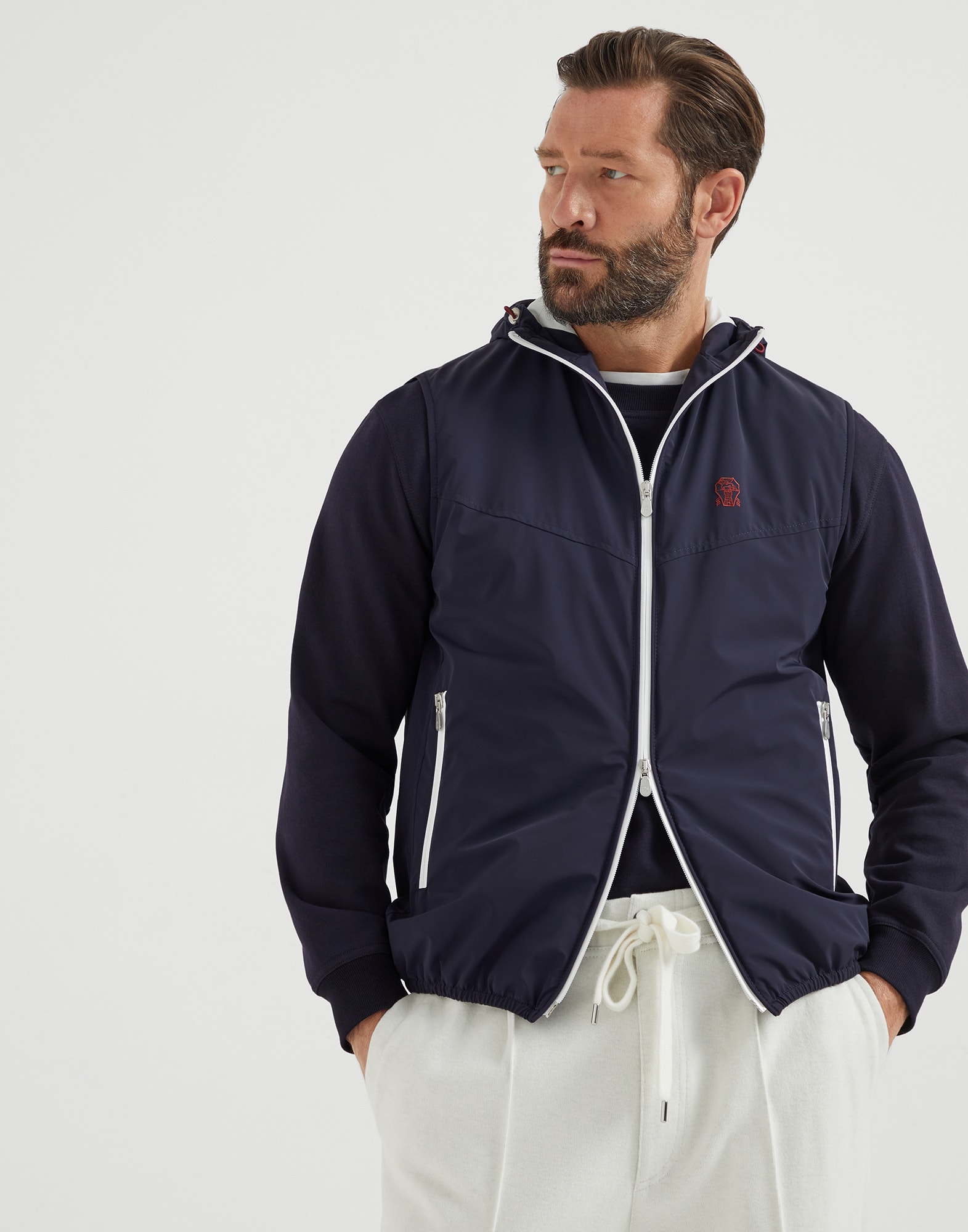 くつろぎやレジャーの時間に捧げられたトラベルウェアラインのスポーティスタイルを高級素材で豊かに仕上げました。このフード付きベストは、ナイロンのテクニカルファブリックの特性を活かしたアイテムで、実用性と機能性に優れています。外側はなめらかで明るく、洗練されたシーズンカラーを引き立て、内側には防水・防風効果を備えた保護フィルムを内蔵しました。快適なボリューム感のレギュラーフィットを、サーモア®フィリングと胸にあしらったアイコニックなロゴディテールで完成しています。