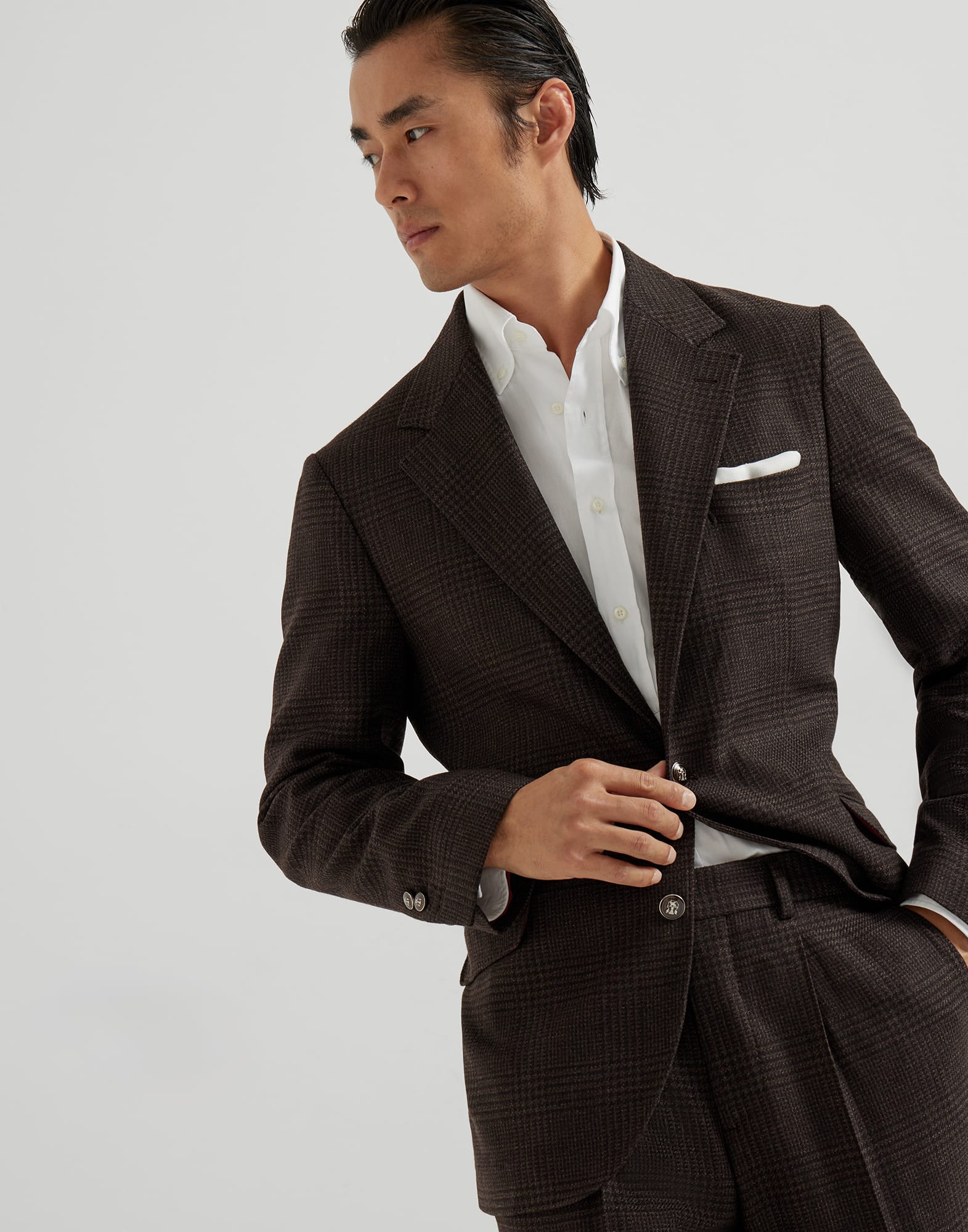 均整の取れた優雅さと素材の高級感が魅力のポイントとなった、メタリックボタン付きのアンコンストラクテッド仕立てカヴァッロフォーマルジャケット。ウール&カシミヤ繊維の包み込むような軽やかさと、シルクの光沢で、シーズンカラーでアレンジしたトーン・オン・トーンのプリンス・オブ・ウェールズ柄を際立たせました。Brunello Cucinelli本社のある集落の名にオマージュした「ソロメオショルダー」が独特のプロポーションをなぞり、このブランドの独自性を引き立てています。すっきりとしていながら存在感があるショルダーラインで、肩パッドを使用せずに男性の体格を魅力的に際立たせました。