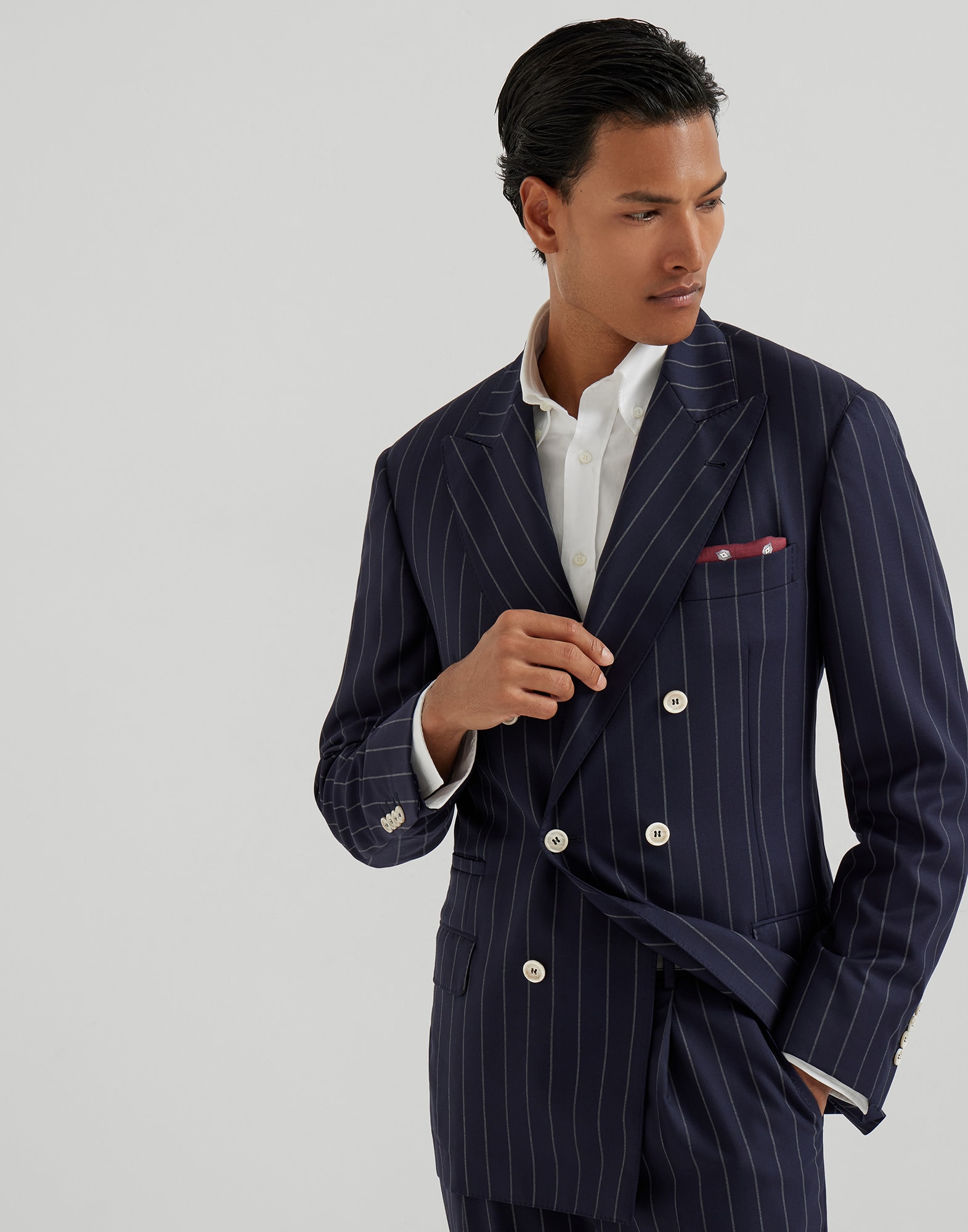 Brunello Cucinelliの高級素材で現代性かつ洗練性をキーワードにレトロなシルエットをアレンジした、ピークドラペル付きのワンアンドハーフブレストフォーマルジャケット。クラシックなチョークストライプ柄をアレンジし、バージンウールスーパー150'sバタヴィアツイルの幅の広いストライプを描いています。Brunello Cucinelliならではのスタイルでプロポーションをなぞる、男性の体格を引き立てるため身頃にぴったりと沿わせてやや肩部分を強調したフィットに仕立てています。