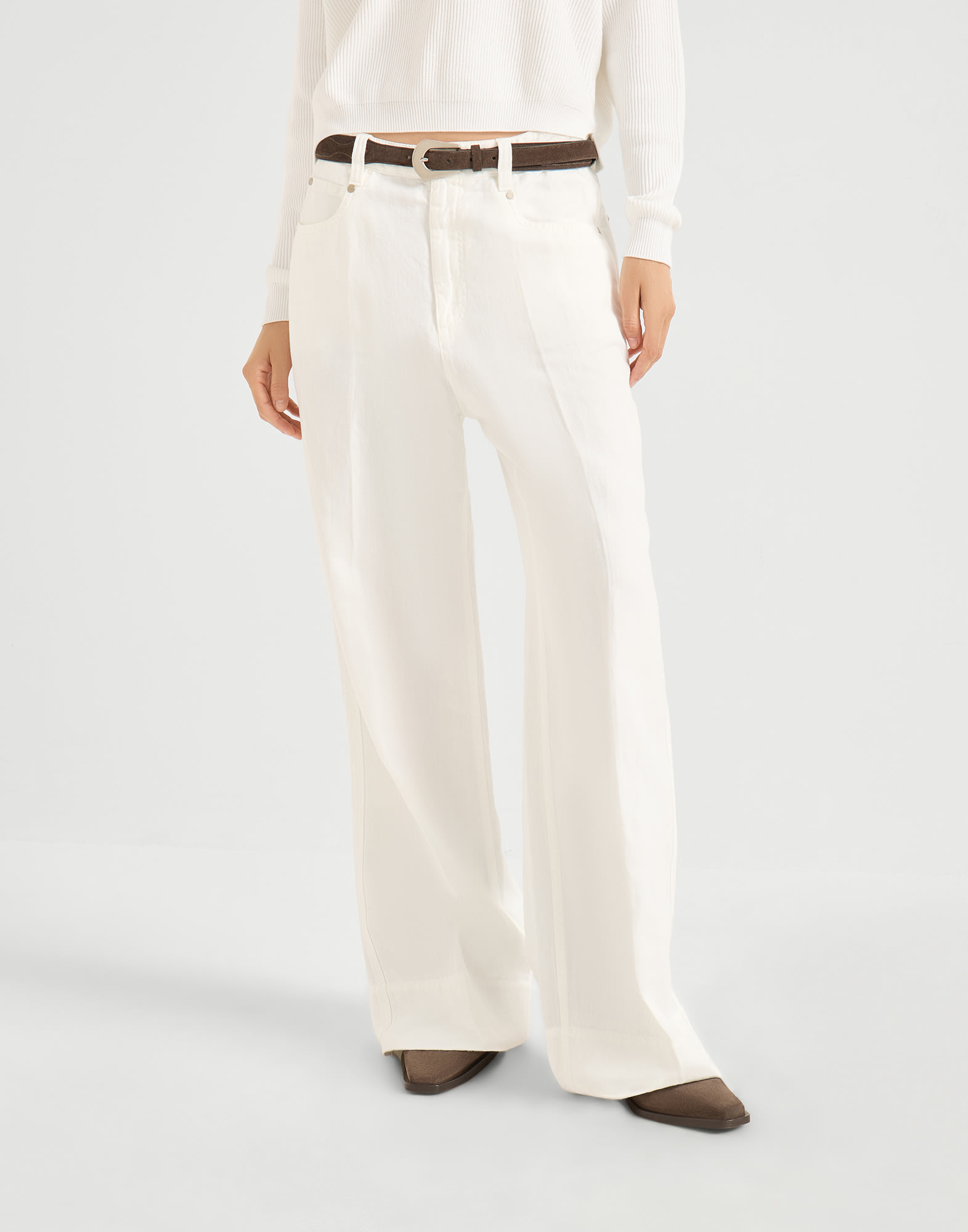 高級コットン&リネンカバーが、夏のテイストのポイントとなる新作ルーズ トラウザーズ。極めて現代的なシルエットが独特なこのアイテムは、サルトリアル調のクリースで強調され、脚に沿ってワイドにストレートに落ちるラインと快適なボリューム感がポイントです。洗練されたスタイルのミックスが生まれました。高貴なモニーレのラベルが、純粋なBrunello Cucinelliスタイルのフェミニンなアクセントを添えて、美しさを完成させています。