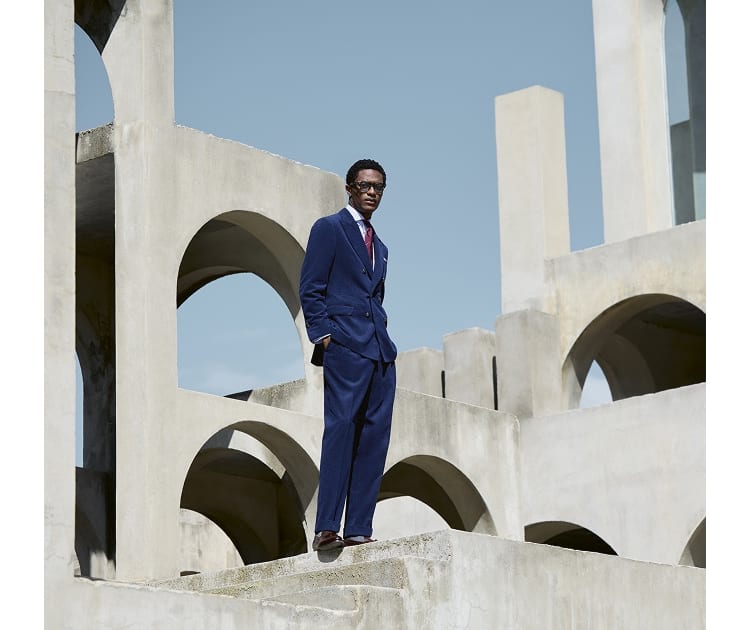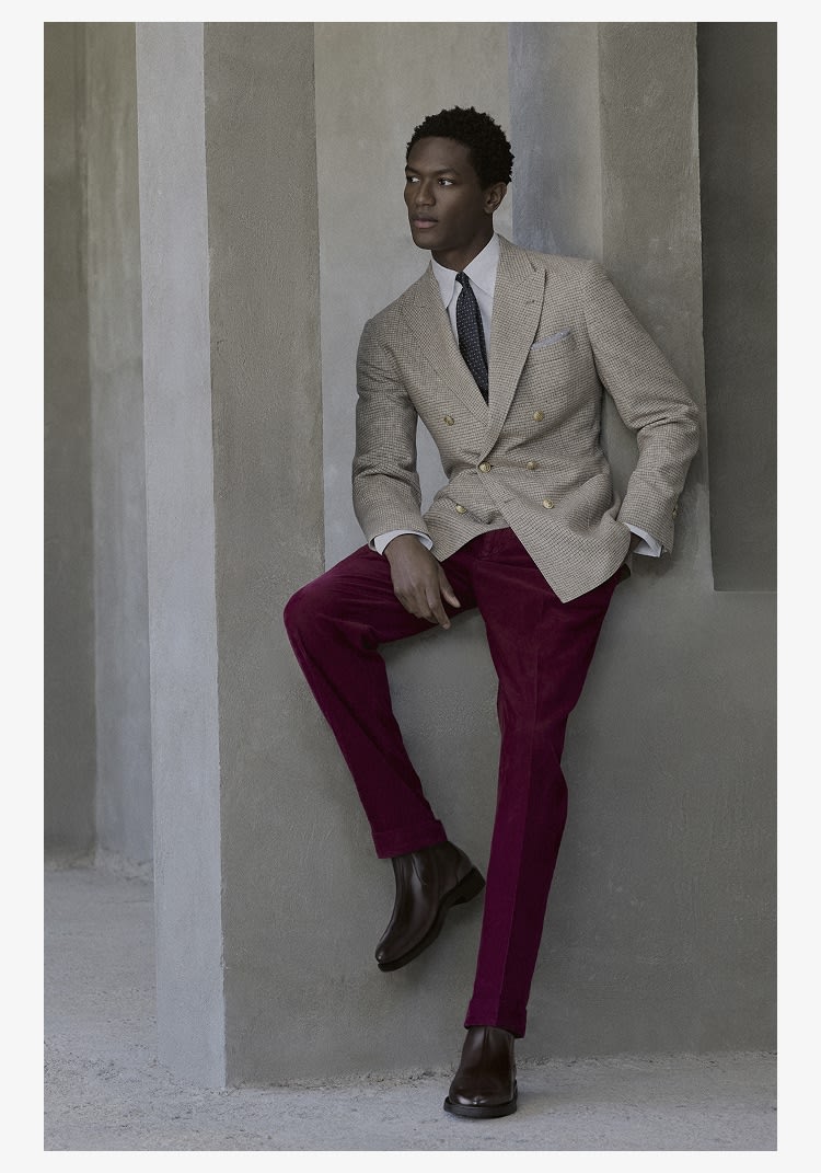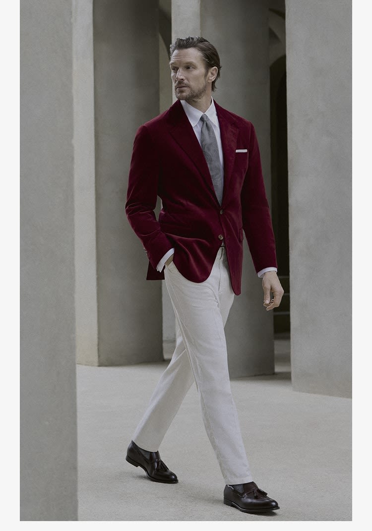 In the FW25 Suit Collection, the iridescent texture of corduroy enhances the season's deep tones, while classic sartorial patterns, such as houndstooth and Prince of Wales, take on the cozy elegance of wool, silk and cashmere fabrics.