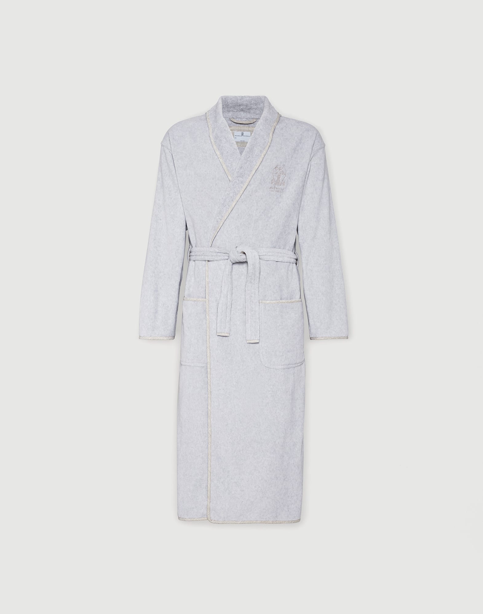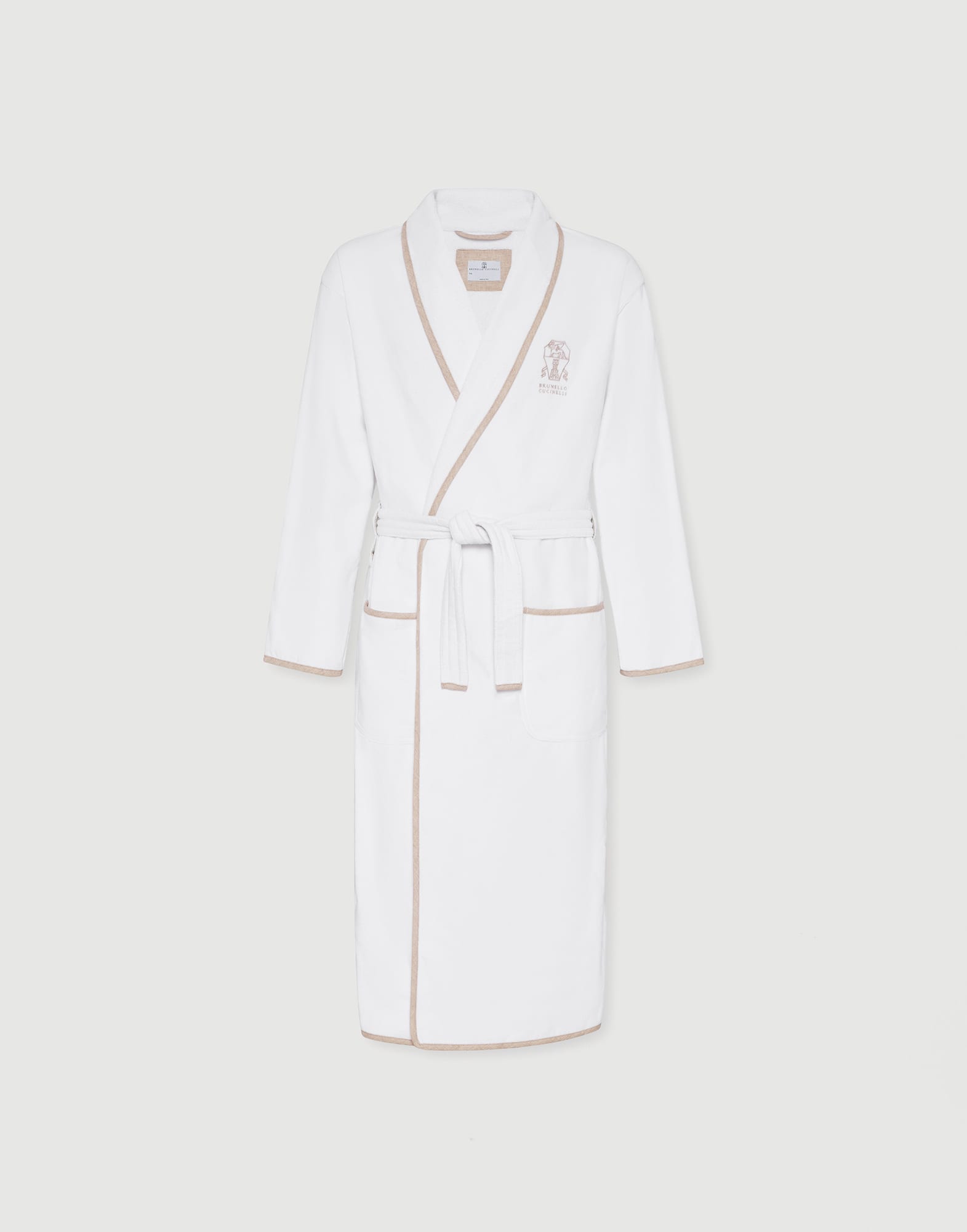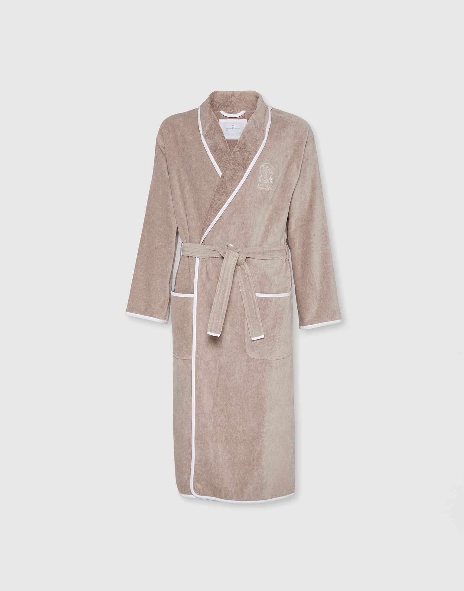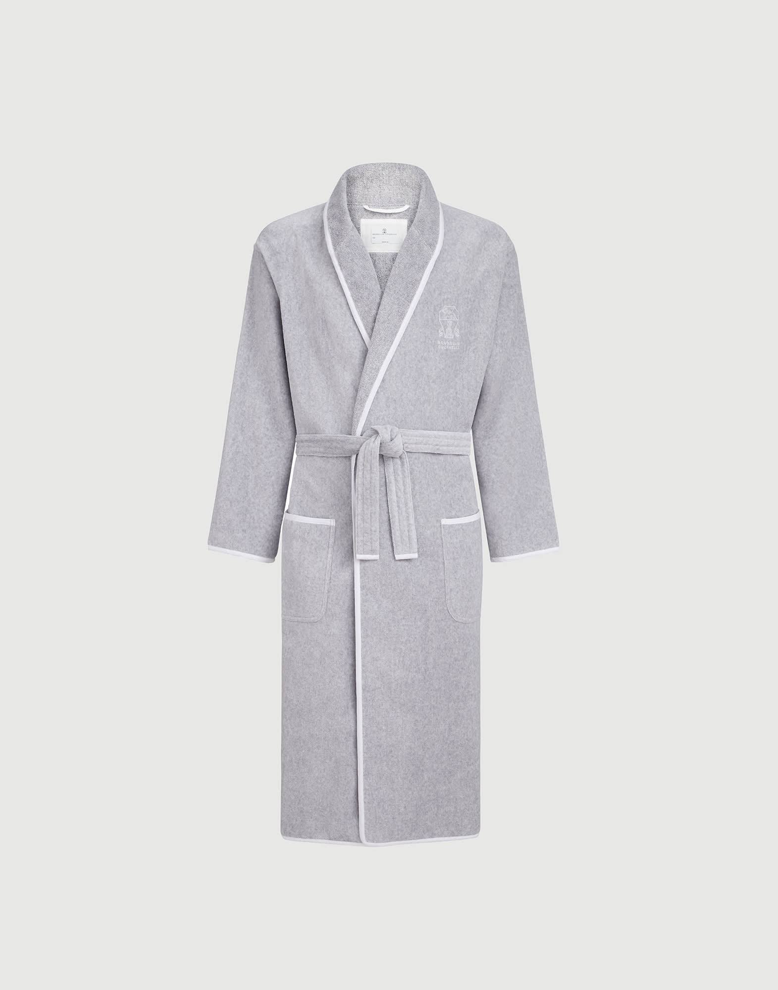 这款棉质毛圈布浴衣手感松柔轻盈,能够为您的休闲放松时刻带去一份精致触感。亚麻镶边和刺绣有 Solomeo 纹章的徽标为浴衣引入了微妙的色彩与质感对比,而扎在腰部的系带升华了功能性设计感。