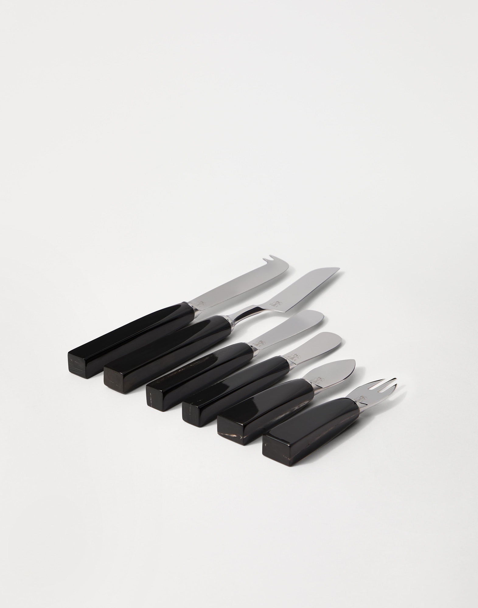 这款 6 件套奶酪刀采用不锈钢制作,包括带有不同刀片的刀具、两把黄油涂抹刀和一个叉子。几何造型的手柄采用水牛角手工制成,淡淡的自然纹理为每只餐具添增一抹自成一家的品味。